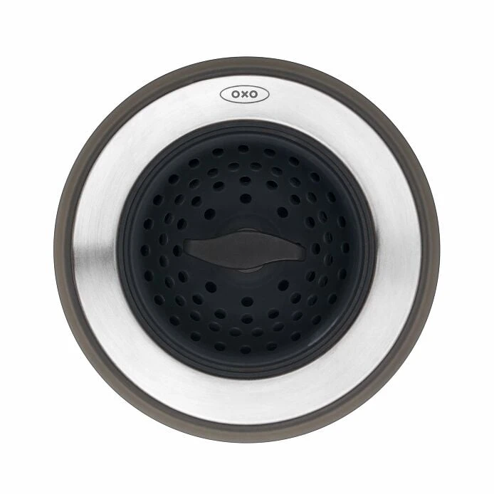 This 2-in-1 tool features a silicone basket that traps food debris and inverts easily to empty. Give the large, comfortable knob a quarter turn in either direction to engage the Stopper and plug the sink. The silicone underside won’t scratch the sink basin. The Sink Strainer with Stopper features stainless steel accents, and is PVC free and dishwasher safe