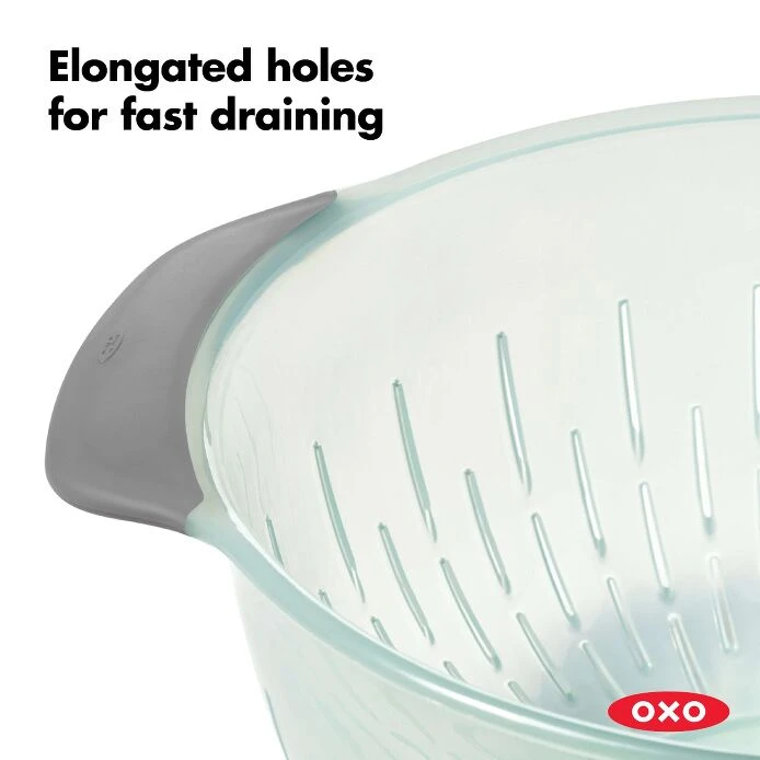 Whether you’re rising veggies or straining pasta, The 5 qtr. colander is ready for the job. The elevated, wave-shaped foot is perfect for draining directly into sinks, and the large handles with soft, comfortable grips make the colander easy to hold. The sturdy construction can handle heavy food and the smooth material is easy to clean.