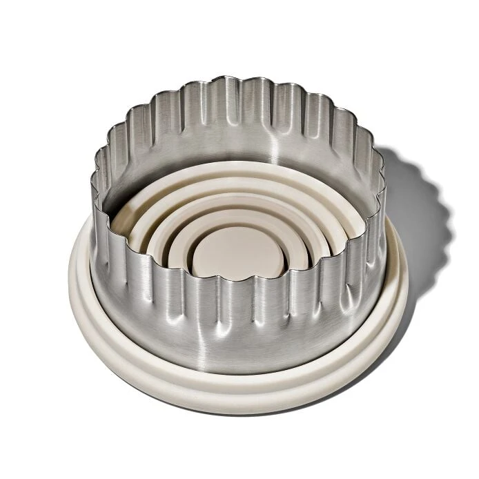 Whether you’re baking cookies, biscuits or scones, the OXO Good Grips Double-Sided Cookie & Biscuit Cutter Set has got the size you need for a uniform batch. Plus they’re reversible—one side is flat and the other is scalloped to give those biscuits, scones or tarts the delicate, fluted edge they deserve. The set of five stainless steel cutters come in 1 in/25.4 mm; 1.5 in/38 mm; 2 in/50.8 mm; 2.5 in/63.5 mm; and 3 in/76 mm sizes. With so many sizes, the possibilities are endless—use them to cook an egg, core an apple or make dumplings. Plus, the set features a soft, non-slip silicone hand guard that’s comfortable and helps prevent hand fatigue while cutting dough. We’ve also included a storage case with lid that makes it simple to store the cutters when not in use. Dishwasher safe.