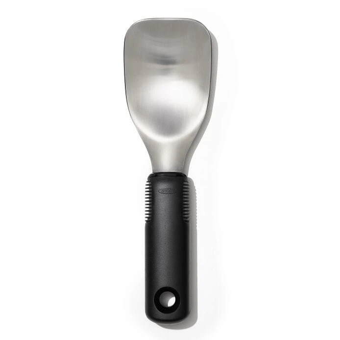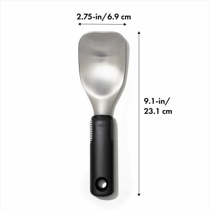 Dish out ice cream for a crowd with the OXO Good Grips Ice Cream Spade. It has a wide, stainless steel head that’s perfect for scooping large servings of ice cream and durable enough for packing pints. The soft, non-slip handle stays comfortable—and won’t get cold during use. Dishwasher safe.Â