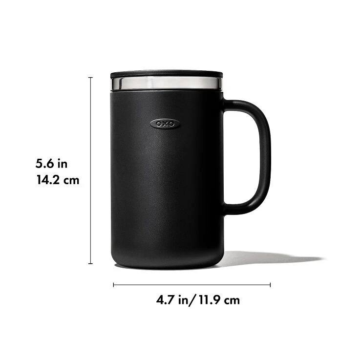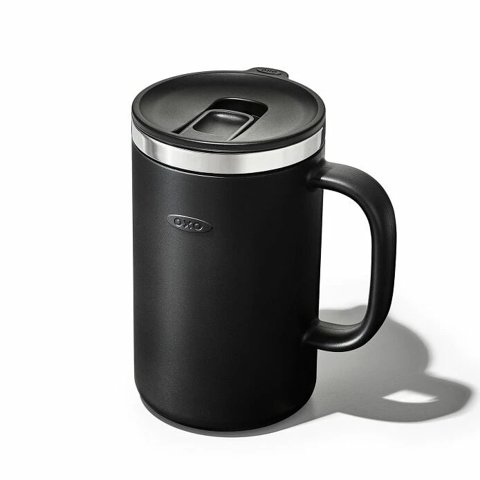 Keep your coffee hot (or cold!) longer with the OXO Strive Insulated Coffee Mug with Handle. It holds 16 ounces and is built to keep your coffee hot for hours. It features an easy-close lid design to help minimize messes. The thoughtfully designed soft touch, wide handle is comfortable in the hand for a more confident grip. The lid’s wide opening is big enough for sipping your morning brew or slurping afternoon soup. Feel like enjoying an iced coffee instead? The lid’s opening easily accommodates a reusable straw too. The Insulated Coffee Mug’s double-wall vacuum insulation is designed to keep your drinks hot or cold for hours keeps your cold drinks cold for 12 hours, and your hot drinks hot for 6 hours. Dishwasher safe, stainless steel, BPA free. By choosing to reuse, you’re doing better for the planet.