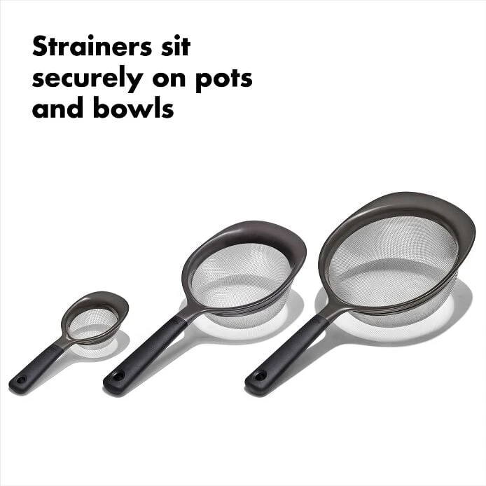 The OXO Good Grips 3-Piece Strainer Set has every strainer you could need: It includes a 3-in/7.6 cm Mini Strainer, a 6-Inch/15 cm Strainer and an 8-in/20 cm Fine Mesh Strainer. You can use the small one to separate lemon juice from seeds and pulp, the medium-sized one to rinse berries and the large one to drain a giant pot of pasta. All three feature comfortable grips, sturdy plastic frames that will stand up over time and well-designed wide rims for stability over bowls or pots. Dishwasher safe.Features Can strain citrus juice, rinse berries, drain pasta and more Includes a 3-, 6-, and 8-inch strainer Wide plastic rims keep strainers stable on pots and bowls Holes in the handles make for easy storage Handles won’t slip, even when wet Dishwasher Safe