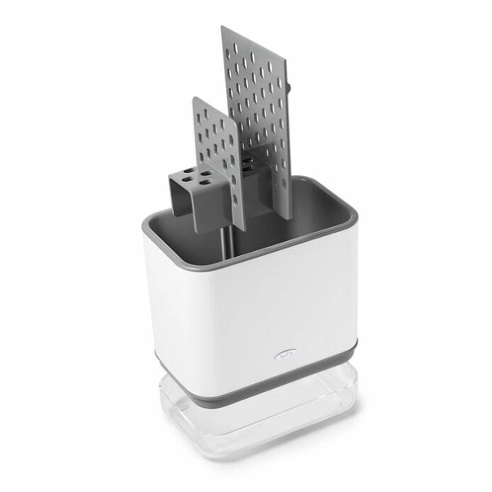 Tackle handwashing dishes once and for all with a Sinkware Caddy that does double duty. This crock-style organizer has two compartments designed for squeaky clean storage. The first compartment stores brushes and other cleaning tools upright for easy access; the second has an elevated sponge tray to keep two sponges dry and super handy. Both are perforated for airflow and to wick water away. Removable drip tray with a built-in spout comes apart for easy cleaning.