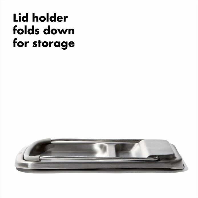 Keep countertops and stovetops neat with the OXO Good Grips Stainless Steel Spoon Rest with Lid Holder. The two-in-one design includes a generously sized base that holds multiple or oversized utensils and a wire Lid Holder that keeps condensation and drippings off surfaces for easy cleanup. Heat-resistant silicone feet ensure the Spoon Rest stays cool to the touch on the stovetop and prevent scratches on countertops. The Lid Holder works with large and small lids and folds down when not in use for compact storage. Dishwasher safe.