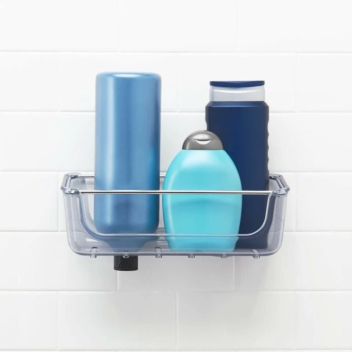 Store more with the OXO Good Grips StrongHold™ Suction Large Basket. Perfect for big families or roommates, the large-capacity Basket keeps shower essentials organized and close at hand. Lever-activated phthalate-free suction cups lock the Basket securely in place, easily adjust with the simple pull of a lever, and slide to avoid grout lines. Drainage holes prevent water build-up, and integrated bottle holes store shampoo and more upside down, so not a drop goes to waste. Tool-free installation. For best results, use on smooth glazed surfaces, mirrors or glass. Not recommended for use with textured or porous surfaces including some stone, acrylic or metal.