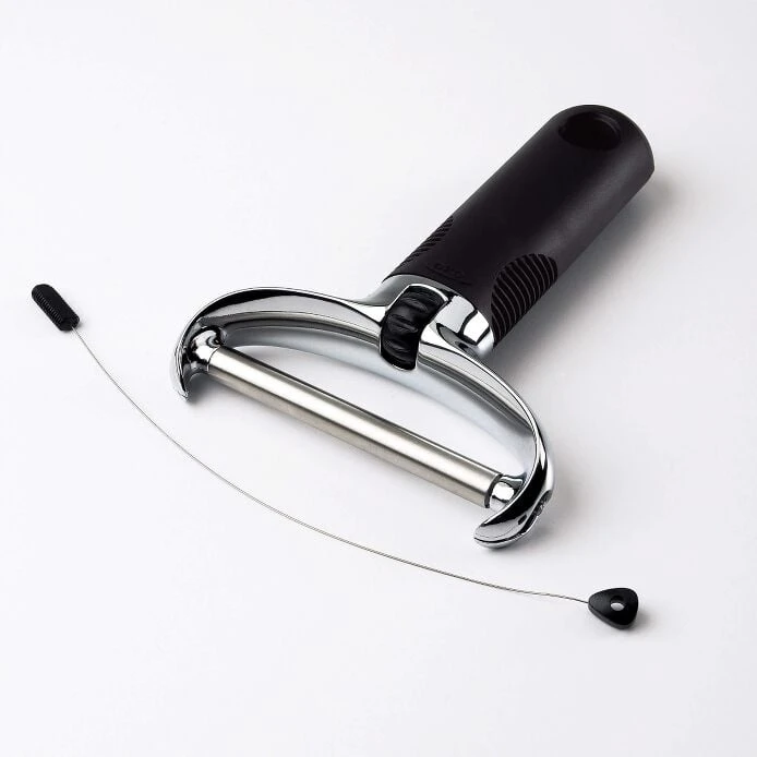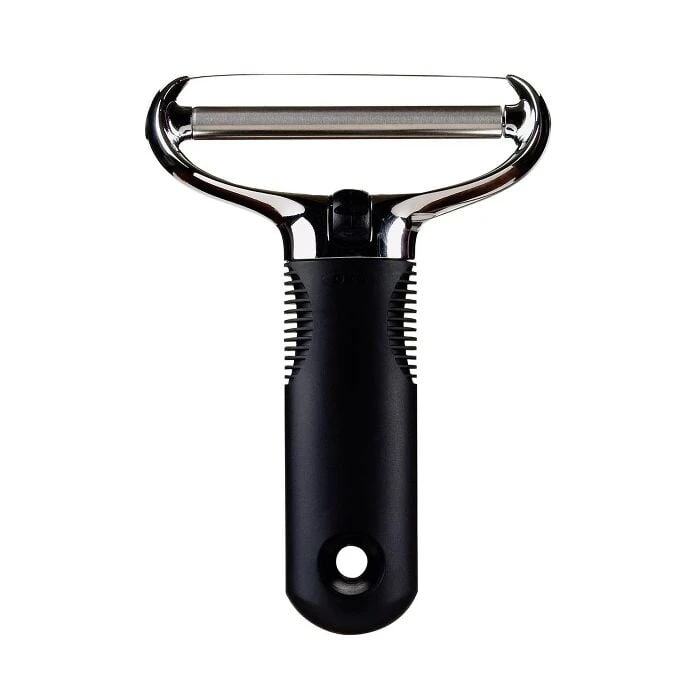 The stainless steel wire on the Wire Cheese Slicer is easy to load and tightens into place with the convenient tensioning wheel. The sturdy, die-cast zinc construction and soft, comfortable handle make it a workhorse at parties. Includes two replacement wires.